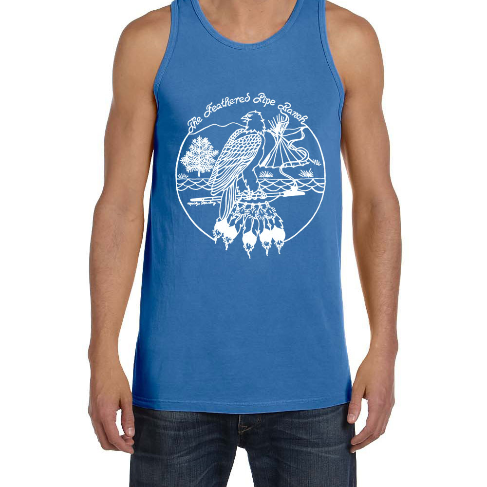 Feathered Pipe Retro design printed on 5.6 oz. Pigment-Dyed Cotton Tank Western Sky. The original Feathered Pipe Ranch t-shirt design was drawn by Marilyn Sternberg in 1976. It graced the front of many t-shirts through the mid-1980s when the Feathered Pipe Ranch switched to a new logo design. Since it is such a fun design we decided to revive it and put it back where it deserves to be admired by conscious people around the world.