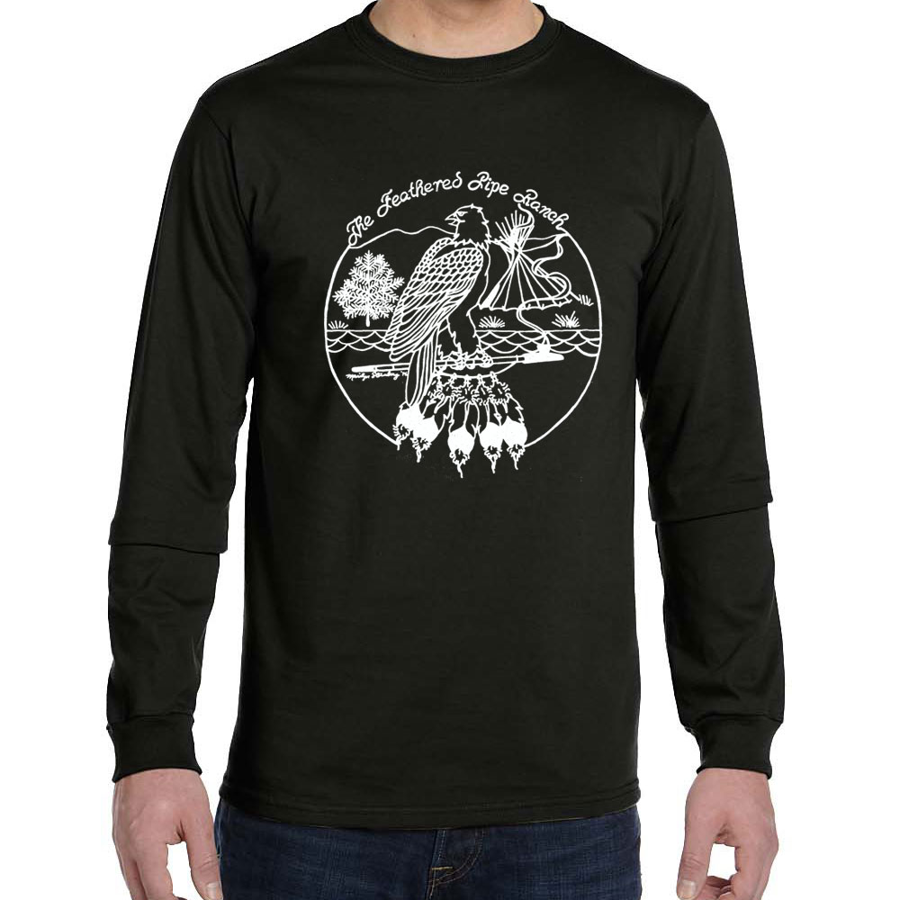 5.5 oz., 100% Organic Cotton Classic Long-Sleeve T-Shirt Black unisex with Feathered Pipe Ranch retro design. The original Feathered Pipe Ranch t-shirt design was drawn by Marilyn Sternberg in 1976. It graced the front of many t-shirts through the mid-1980s when the Feathered Pipe Ranch switched to a new logo design. Since it is such a fun design we decided to revive it and put it back where it deserves to be admired by conscious people around the world.