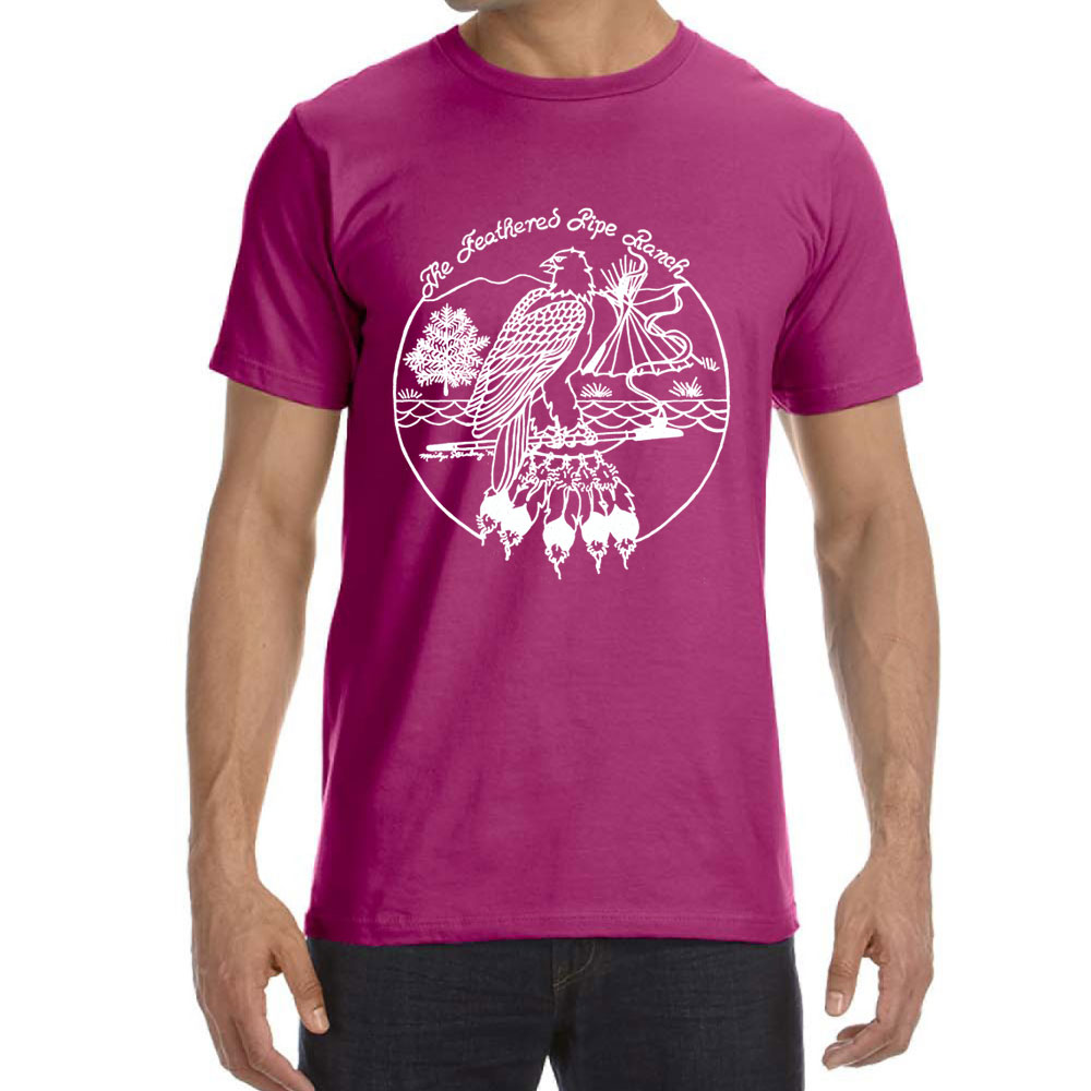 4.5 oz., preshrunk 100% certified organic combed ringspun cotton, raspberry with Feathered Pipe Ranch retro design. Unisex. The original Feathered Pipe Ranch t-shirt design was drawn by Marilyn Sternberg in 1976. It graced the front of many t-shirts through the mid-1980s when the Feathered Pipe Ranch switched to a new logo design. Since it is such a fun design we decided to revive it and put it back where it deserves to be admired by conscious people around the world.